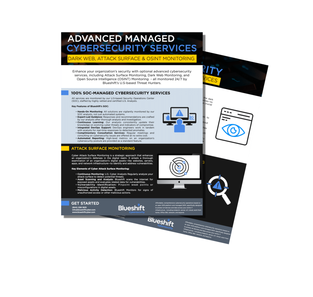 Blueshift Cybersecurity delivers cutting-edge, AI powered cybersecurity solutions backed by a 24/7 U.S.-based Security Operations Center. Our advanced XDR Suite integrates real-time threat detection, automated response, and human expertise to secure networks, cloud environments, endpoints, and remote teams. To further strengthen your cybersecurity posture, Blueshift offers a range of advanced monitoring tools: Dark Web Monitoring scans unindexed corners of the internet to detect exposed credentials, passwords, and sensitive business data—alerting you in real-time to potential breaches so you can act fast. Attack Surface Monitoring continuously scans your digital assets—websites, servers, and cloud infrastructure—for vulnerabilities, misconfigurations, and exposed entry points that attackers could exploit. Open Source Intelligence (OSINT) Monitoring analyzes publicly available information from news, forums, and social media to proactively identify emerging threats, cybercriminal chatter, and evolving attack tactics relevant to your organization. Protective DNS (PDNS) blocks access to known and emerging malicious domains used in phishing, malware distribution, and botnet activity by leveraging threat intel from open-source, commercial, and government feeds, as well as proprietary pattern recognition. Each of these tools integrates seamlessly with the Blueshift XDR Suite, providing enhanced visibility and faster incident response across your entire threat landscape. Whether you're looking to improve your real-time threat detection, stay compliant with industry regulations, or proactively hunt threats before they strike—Blueshift’s AI driven platform and expert SOC team have you covered. Ready to take your cybersecurity to the next level? Contact us today to learn how our AI powered cybersecurity solutions can protect your business.